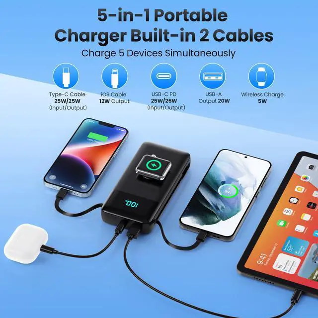 - 5-in-1 Portable charger:With a total of 5 output ports (2 built-in cables, 1 iWatch Charger, 1 USB-A, and 1 USB-C), this power bank can charge up to 5 devices simultaneously.