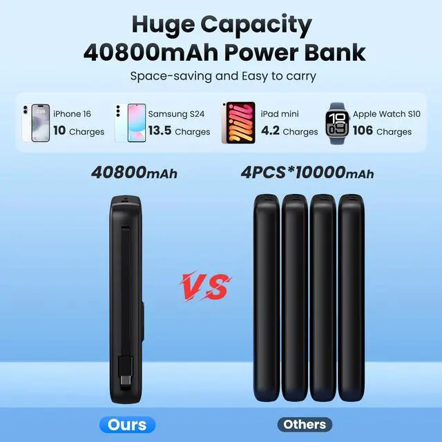 - 40800mah High-Capacity Portable Charger:With a massive 40800mAh battery capacity, this power bank can keep your devices running for days, providing ample power for your phones.