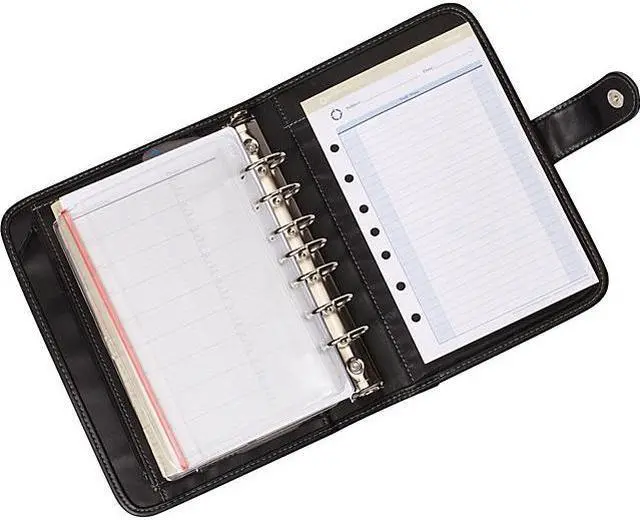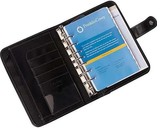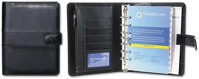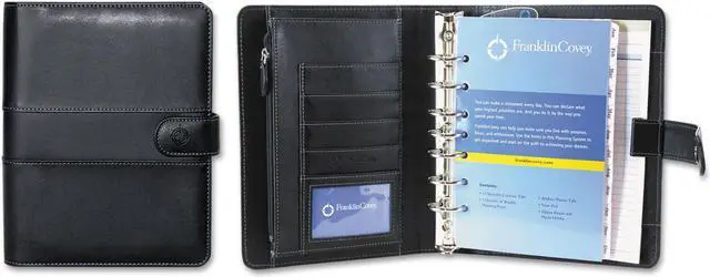 Interior pockets accommodate business cards, credit cards or self-stick notes. Each binder accepts most brands of time management fillers. Starter set includes samples of both daily and weekly planning pages, goal-planning pages, page tabs printed with the months of the year, mission/values forms with corresponding tabs, a page-finder pouch, weekly compass cards, financial and general information forms with corresponding tabs, address/telephone tabs, a zipper pouch, a photo holder and a note pad. Size: 9 1/2 x 7 1/2; Page Color/Theme: White/Blue; Appointment Ruling: Hourly, 8 AM to 8 PM (Sun.-Sat.); Edition Year: 2016.