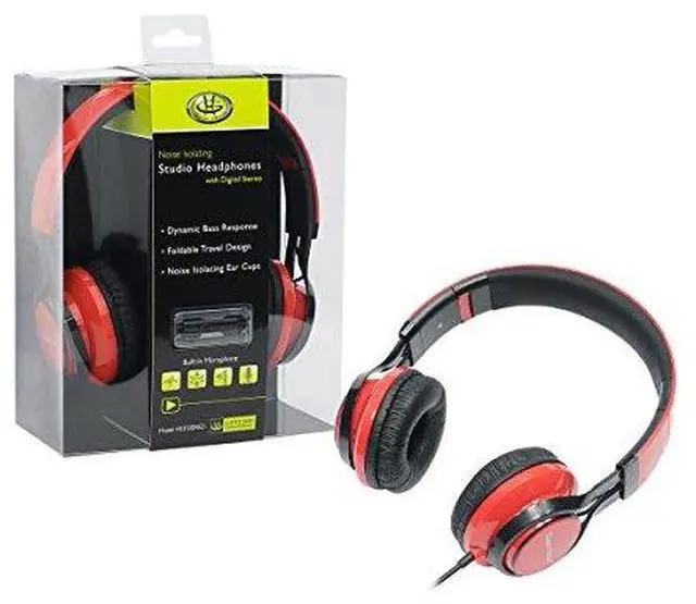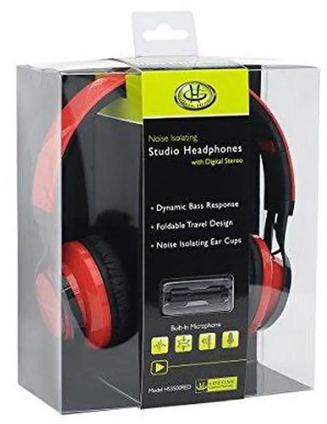 Dynamic Bass ResponseEnjoy sharp, deep bass with comfortable ear cushions and custom-shaped 40mm drivers.Noise Isolating Ear CupsOur innovative 3-piece foldable design was perfected for travel and stows easily into small spaces. Foldable Travel DesignCombining plush ear cups and an adjustable headband, these state-of-the-art headphones create a comfortable seal to isolate you from ambient room noise.Built-In MicrophoneTake phone and conference calls with ease using the convenient integrated microphone.Connectivity Technology: WiredSound Mode: StereoFeatures: Noise IsolationFeatures: FoldableFeatures: Adjustable HeadbandFeatures: Deep BassFeatures: ComfortableEarpiece Design: Over-the-headEarpiece Type: BinauralDriver Size: 1.57Microphone Design: On-cableColor: BlackColor: Red AccentForm Factor: CircumauralPackage Contents: Studio Headphones with Digital Stereo User Manual Warranty information Limited Warranty: LifetimePackage Contents Studio Headphones with Digital Stereo User Manual Warranty information "