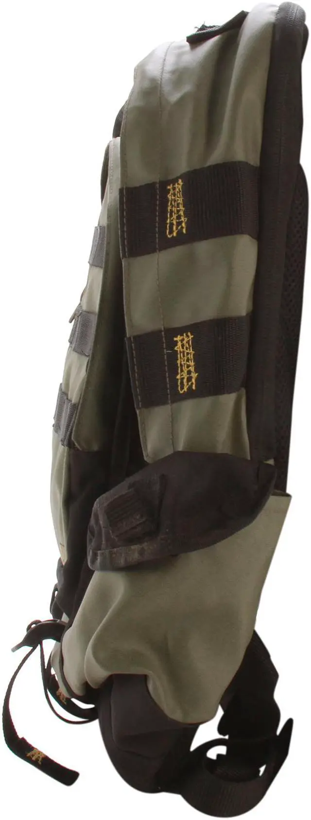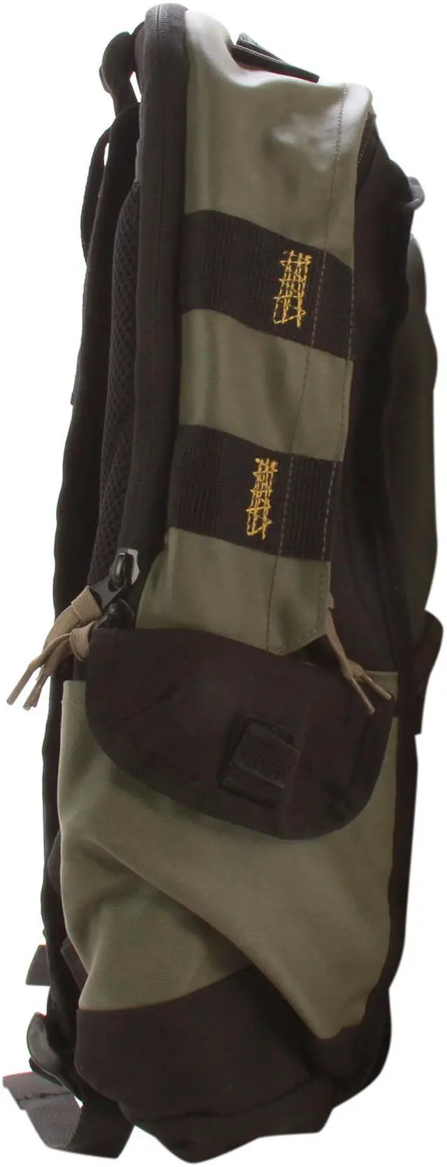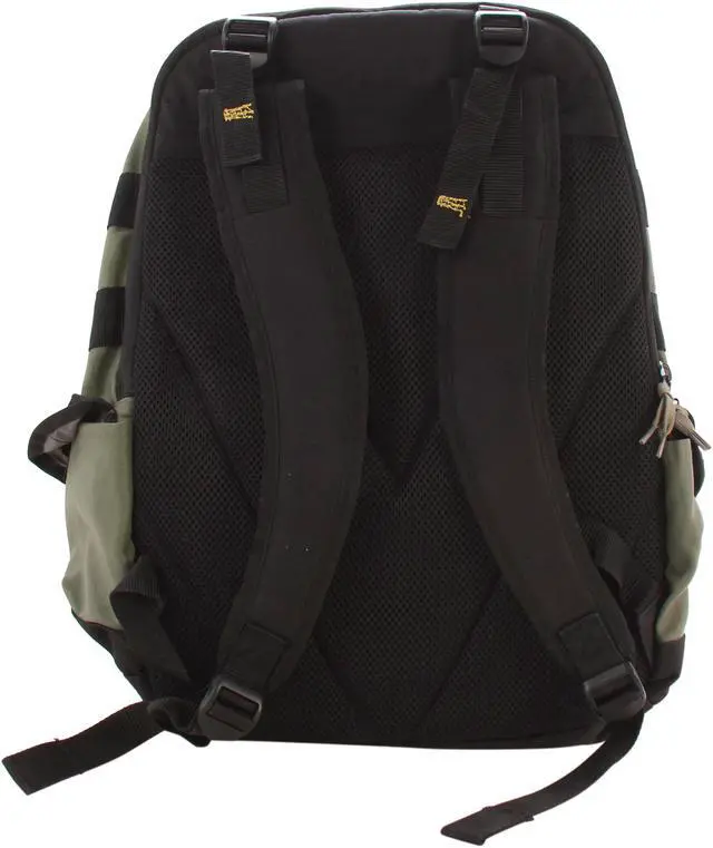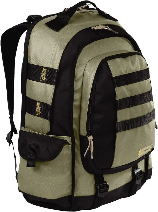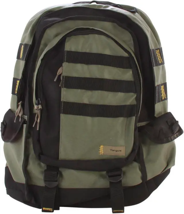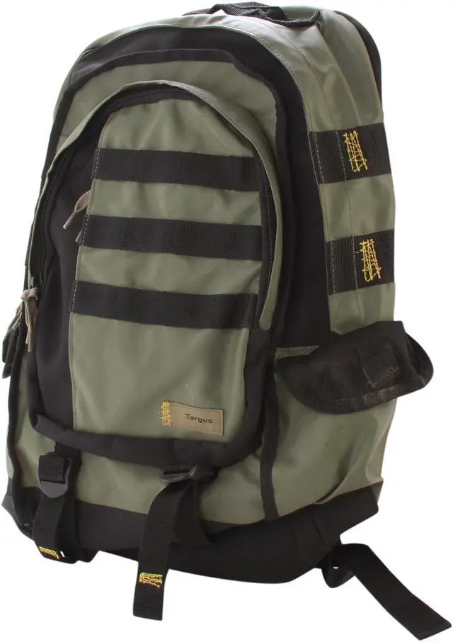 The Targus 16” Military Laptop Backpack is designed to fit up to 16” laptops. The large capacity backpack features a laptop compartment with scratch-resistant lining to keep the laptop protected from bumps and scratches. The Military backpack features a second large compartment to store books, binders, documents and more. This section also features two convenient pouches to hold smaller accessory items. The large front pocket includes a scratch-resistant mobile phone compartment, pen loops and a key clip. The two large self-closing side pockets provide easy-access storage for additional items. Two adjustable straps on the exterior of the case allow you to secure a variety of items for travel such as a jacket or sweater. The heavily padded back panel and contoured shoulder straps provide a comfortable, ergonomic fit. For added color this green and black backpack features artistic yellow accent stitching and zipper pulls that resemble shoe laces for a distinctive style.