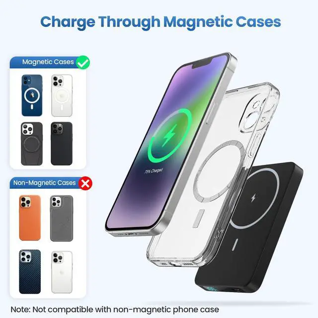 Magnetic Charging for iPhone 17/16/15/14/13/12 SeriesThis magnetic portable charger is special designed for iPhone 17/17 Pro/17 Pro Max/16/16 Pro/16 Pro Max/15/15 Plus/15 Pro/15 Pro Max/14/13/12 series and mag-safe case. In addition, the USB-C power bank can charge your other devices by charging cable at the same time while magnetic charging.