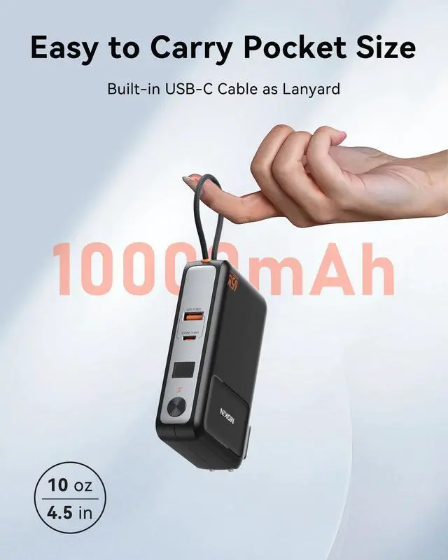 All in one travel power bank, this is airplane travel essentials, you would not need to carry various cables any more. 10000 mah Power bank charge an iPhone 16 up to 1.5 times, Samsung S22 up to 2.0 times, iPad mini up to 1.3 times. Portable phone charger with LED display, accurate percentage of remaining battery and fast charging status