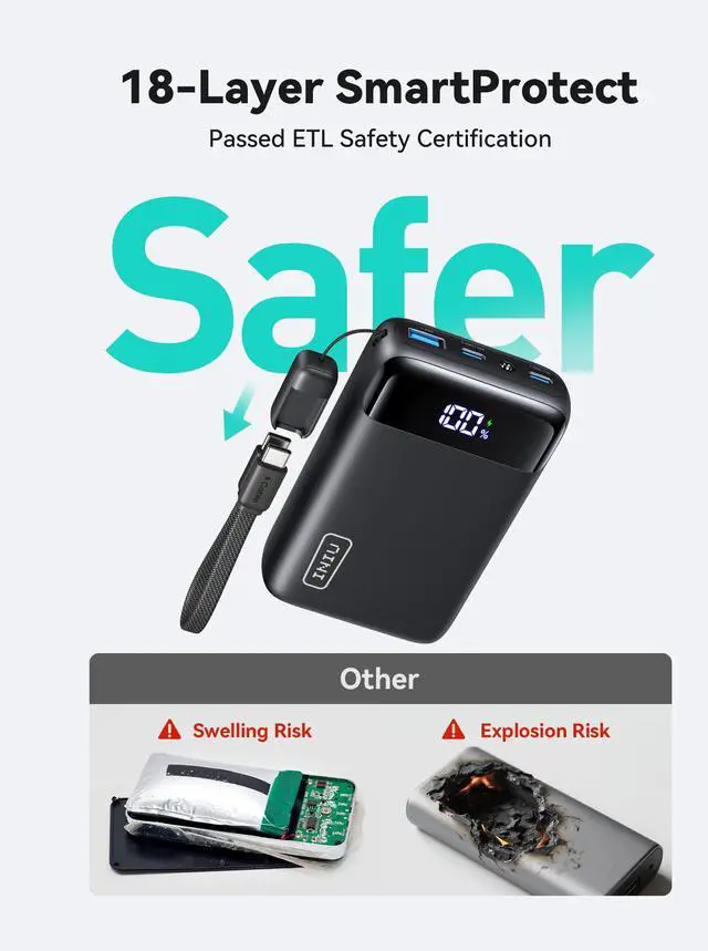 INIU power banks feature a Smart Temperature Monitoring System that adjusts output to prevent overheating. It delivers max power when your device is low, then reduces power to protect your battery and improve efficiency.