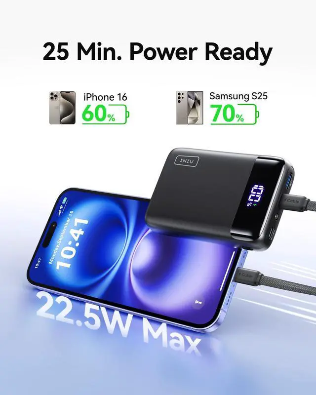 INIU power banks feature a Smart Temperature Monitoring System that adjusts output to prevent overheating. It delivers max power when your device is low, then reduces power to protect your battery and improve efficiency.