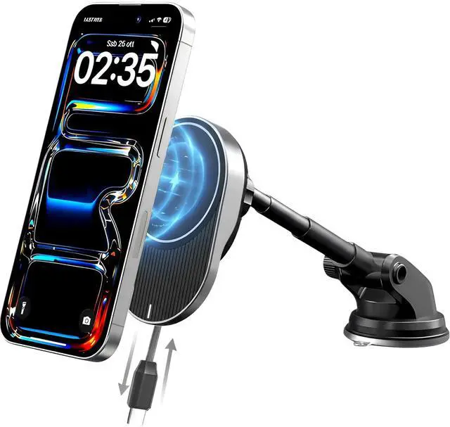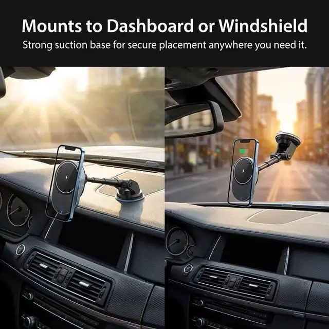 Magnetic Wireless Car Charger: MagSafe compatible phone charger providing up to 15W wireless charging power.