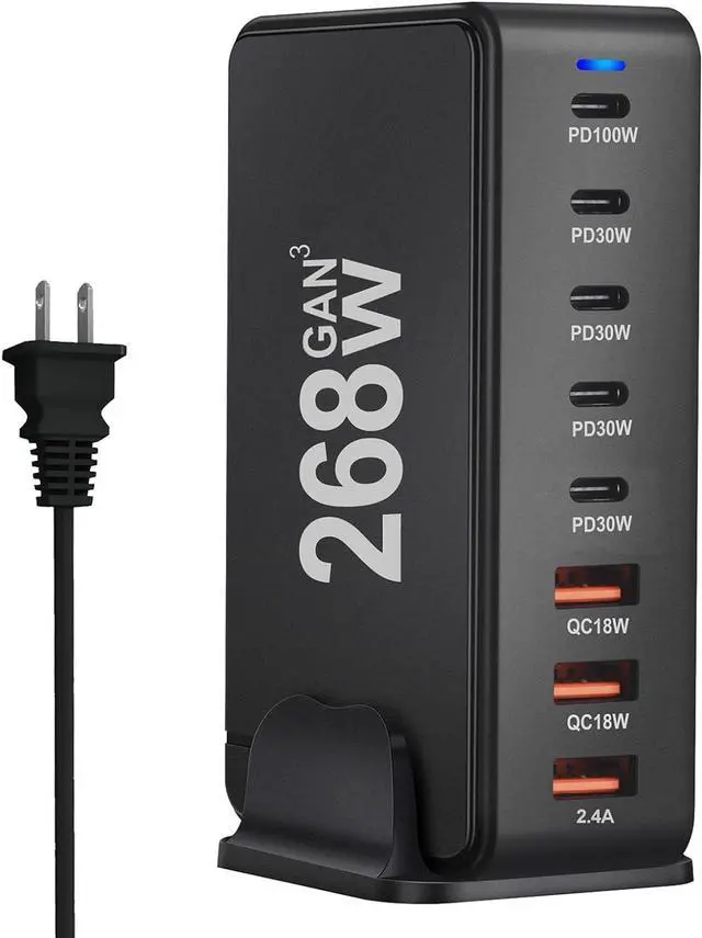 Total 268W 8-in-1 USB C Charger: Which devices will you charge with this 8-in-1 USB C faster charger? Boasting 5 x USB-C ports (total 220W) and 3 x USB-A ports (total 48W), this USB C charging station is capable of delivering power for 8 devices at the same time while saving space and keeping your desktop tidier.