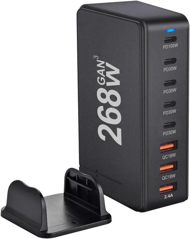 Total 268W 8-in-1 USB C Charger: Which devices will you charge with this 8-in-1 USB C faster charger? Boasting 5 x USB-C ports (total 220W) and 3 x USB-A ports (total 48W), this USB C charging station is capable of delivering power for 8 devices at the same time while saving space and keeping your desktop tidier.