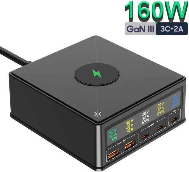 160W 5-Port USB Charging Station with 65W PD, QC3.0, Wireless Charger, LCD Display