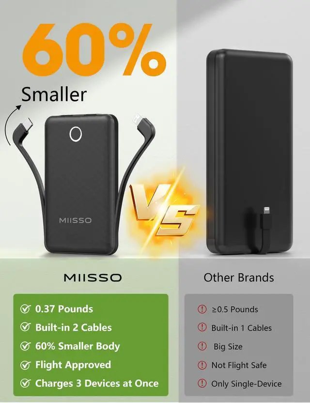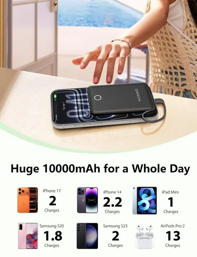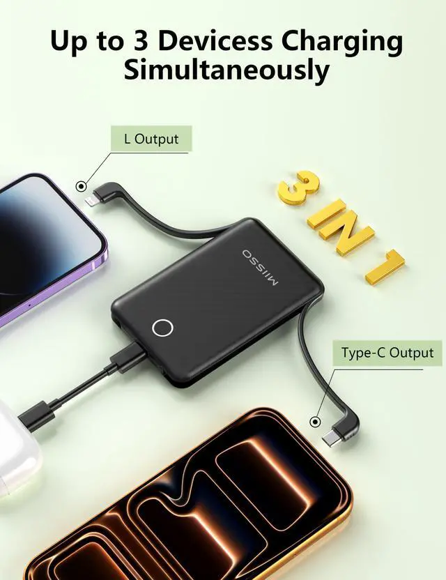 Pocket Size: It is the Smallest JAYSUING 10000mah Power Bank, 2025 upgraded version. Its body is slim and small, 4.25*2.74*0.67inch, really pocket size. You can carry it in your handbag or pocket. It will be your most important partner daily. And when you are traveling or on a business trip that will be helpful Portable charger with built in cables:This power bank is built-in type C cable and other cables that compatible with mobile phone directly, such as for iphone 17, for iphone 16, for iphone 15, for iphone 14, for iphone 13, for iPad, for Samsung, for other USB C port phones. You do not need to take charging cables High Capacity: Contains 10000mAh of power. Enough to provide over 2 entire replacement charge for iPhone 17, for iPhone 16 and Samsung Galaxy S25. 10000mAh can meet your daily electricity demand Charging for 3 Devices at The Same Time: Portable charger has 3 outputs, you may charge 3 devices max at the same time. It also has USB C input that you can use Type C cable to recharge battery pack conveniently Universal Compatible with Most Devices: As portable phone charger builts in 2 cables, it is widely compatible with most cellphones or tablets. Widely compatible with iPhone 17, 16, 15, 14, 13, AirPods 4, Samsung S25, S24,S23, Z fold series, Z flip series,and other andorid USB C or Micro USB phones, tablets What You Get: 10000mAh Battery Charger x 1, USB Charing Cable x 1 and User Guide x 1