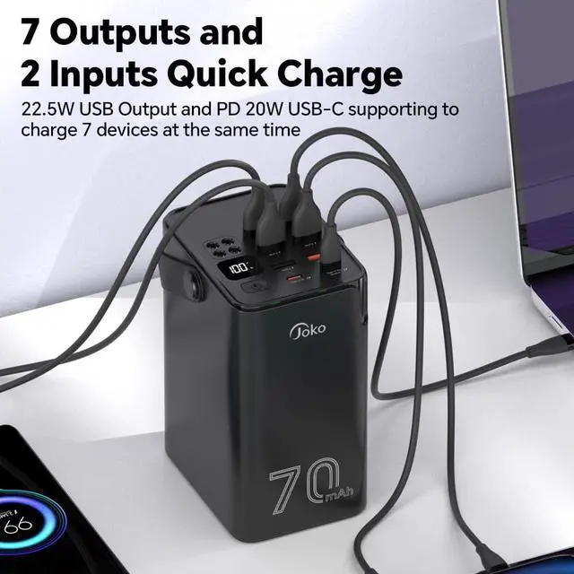 - It can be used continuously for a week, the long-lasting portable charger is very suitable for travel, music festivals, dramas, playing games, camping, hiking and more,with a substantial 70000mAh of charging power and 7 output ports for almost any device-charging need .The strong hanging belt is tough and wear-resistant,more convenient for your hand holding, you can also put the battery pack in your backpack or shoulder bag for outdoor activities .
