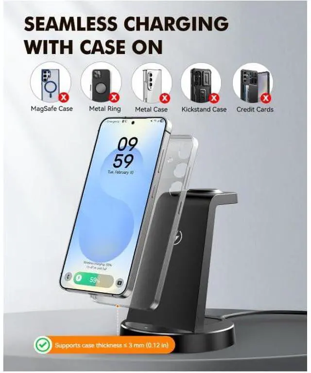 Charging for Phone Case: This wireless charger stand conveniently charges right through its case (up to 3mm/0.12" thick). For optimal performance, please use with non-metal, non-wallet-style, and smooth-surfaced cases