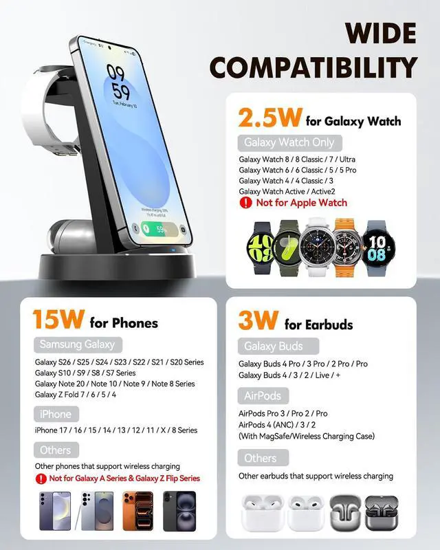 ?Phone?compatible with Samsung Galaxy S26 Ultra/S26+/S26/S25 Ultra/S25+/S25/S24 Ultra/S24+/S24/S23 Ultra/S23+/S23/S22 Ultra/S22+/S22/S21/S20/S10/S9/S8/Ultra series; Galaxy Note 20/10/9/8 series; Galaxy Z Fold 6/5/4 series; iPhone 17/16/15/14/13/12/Pro/Max/SE series, and other Qi-enabled phones. ?Watch?compatible with Samsung Galaxy Watch/Watch Classic/Watch Ultra/Watch Active series. ?Earbuds?compatible with Samsung Galaxy Buds 4 Pro/4/3 Pro/3/2 Pro/ 2/ Pro/FE/Buds+/Live/AirPods 3rd generation 2021/Airpods 2/1/AirPods Pro.?Note? Not compatible with Galaxy Z Flip series, Galaxy A series, or Apple Watch)