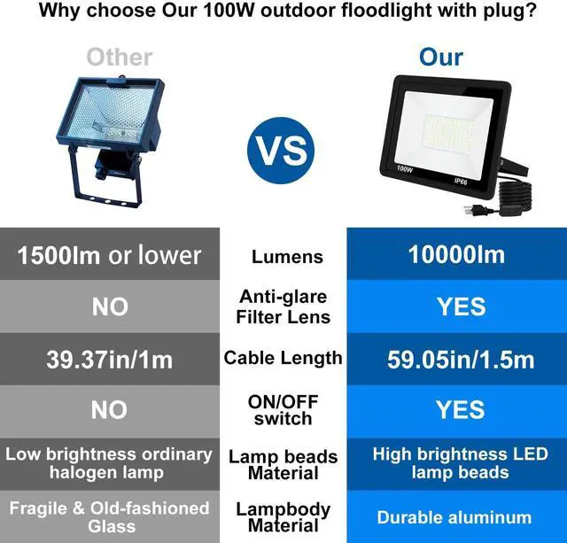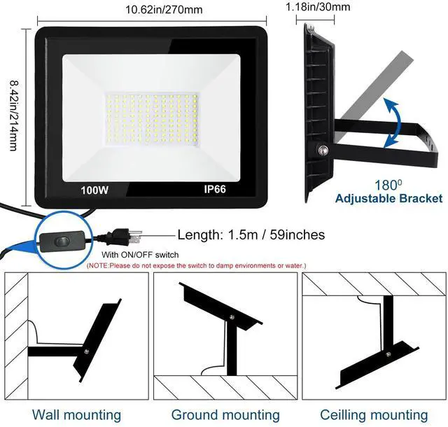 Convenient 59 Inch Cable with Switch: Featuring a 59 Inch cable with a US-3 plug, this reflector offers a longer reach than most similar products on Amazon. The built-in ON/OFF switch adds convenience, while the 120°beam angle ensures broad, shadow-free, and anti-glare lighting for your outdoor spaces. (Note: The switch is not waterproof; avoid exposure to moisture.)