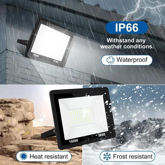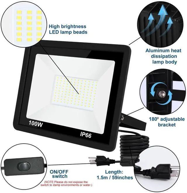 LED Flood Light Outdoor,100W LED Work Light with ON/Off Switch Plug in Security Lights IP66 Waterproof 6500K 2Pack Portable Exteriores Floodlights for Yard Garage Stadium Garden Patio