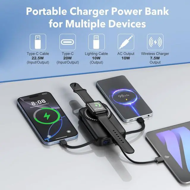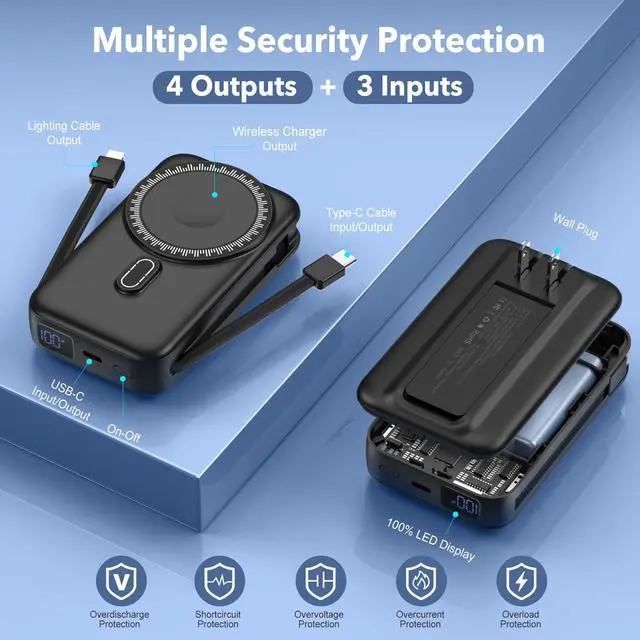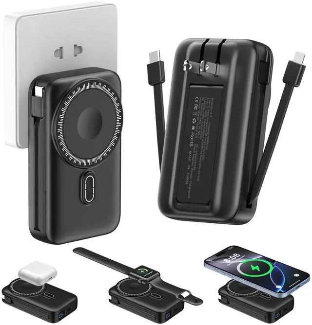 Magnetic Portable Charger 10000mAh for iPhone with Built-in Cables and Wall Plug,Wireless Power Bank with iWatch Charger,Battery Pack for iPhone 16/15/14/13/12 = Built-in Cables + 3 in 1 Wireless Charging (iPhone 17/16/15/14/13/12, Apple Watch,AirPods) +4 Output +LCD Display+Wall Plug