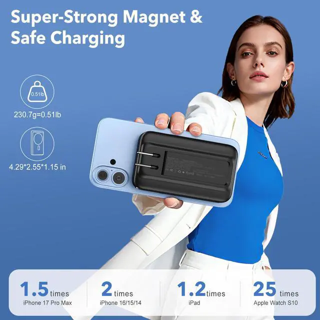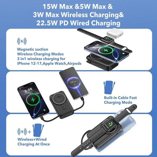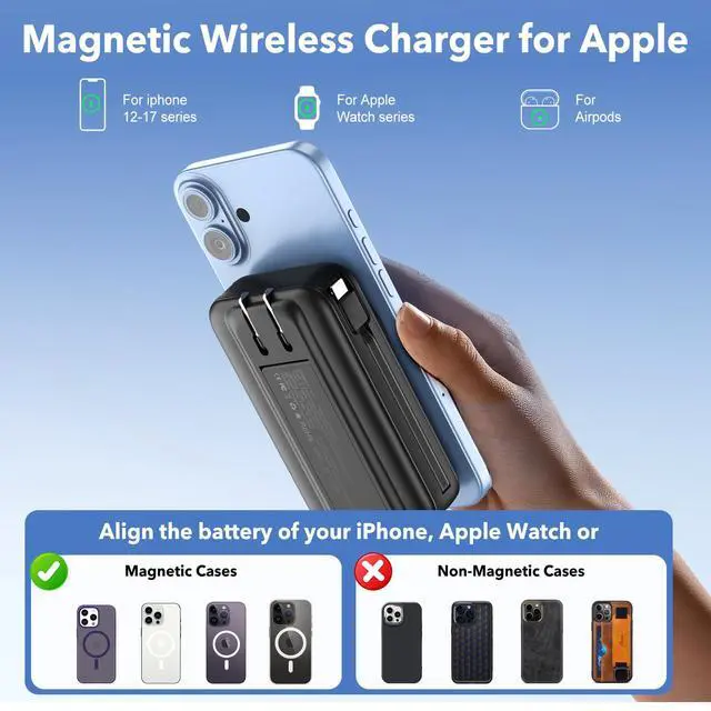 | Wired Charging for Others: | ompatible with All iPhone 17/17Air/17 Pro/17 Pro Max/16/16 Plus/16 Pro/16 Pro Max/15/15 Plus/15 Pro/15 Pro Max/14/14 Plus/14 Pro/14 Pro Max, iPhone 13/13 Pro/13 Pro Max/12/12 Pro/12 Pro Max,iPhone 11/XR/XS Max/8/8 Plus/7/7 Plus/6/6s/6 Plus, Apple Watch 10/9/8/7/6/5/4/3/2/Ultra 2/1/SE and Airpods 2/3/Pro/Pro 2. (Note: Please use Mag-Safe phone case or without case for wireless charging).Samsung S22/S23 Series,Google Pixel,LG, Moto,tablets,Android devices,smart devices and so on. |