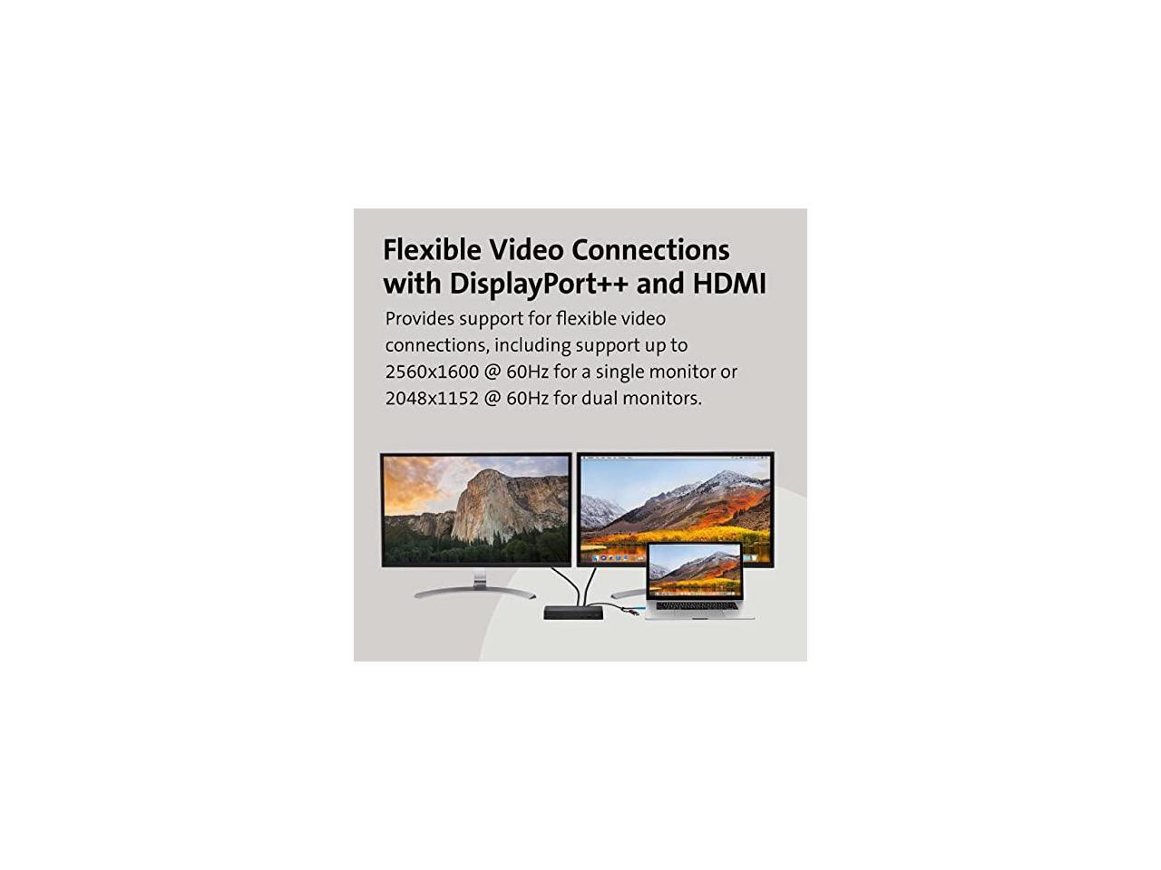 - Dual monitor dock provides Dual or Single 2k@60Hz via DisplayLink; 1 HDMI 2.0 port and 1 DisplayPort 1.2++; DisplayPort connections can use a passive cable (see part# K33021WW)