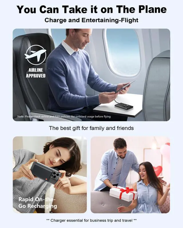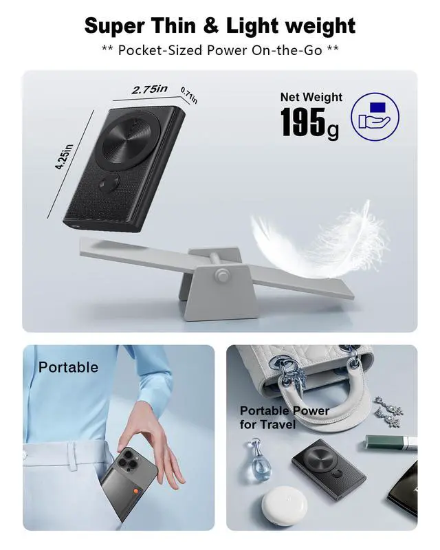 Perfect Size for On-the-Go: This power bank measures just 4.2×2.7×0.7 inches and weighs only 0.43lbslighter than most wallets. The ultra-slim design effortlessly fits in pockets or bags, making it the perfect charging partner for business trips, daily commutes, and travel adventures.