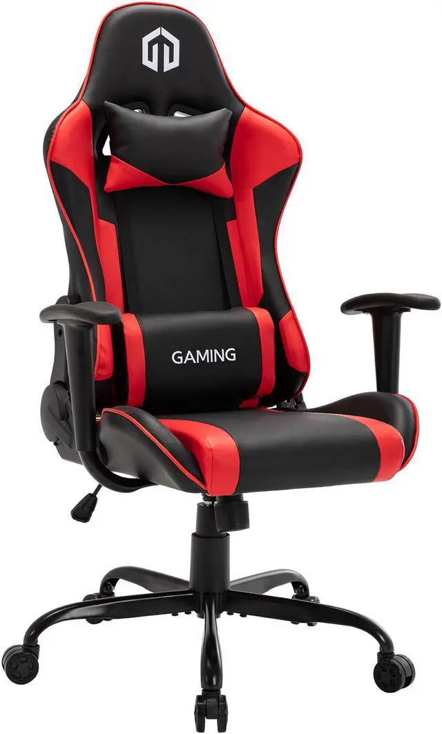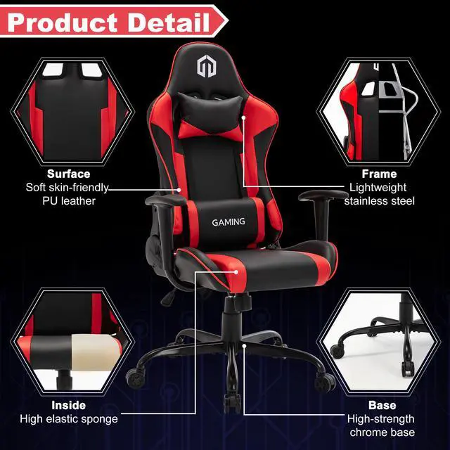 Experience the difference this feature-packed gaming chair can make to your efficiency and well-being. It's built to be tough and sturdy with stainless steel frame, padded with premium quality sponge and upholstered with high quality PU leather that's great to the eyes and touch. The wide seat and high back are accessorized with a headrest pillow and a lumbar pillow giving you full support. Adjust the seat height, or recline the seat back all the way to flat to meet your personalized ergonomic needs. This chair also has a stable five-star base that supports 360-degree swivel, and is fitted with smooth-rolling casters for easy mobility.
