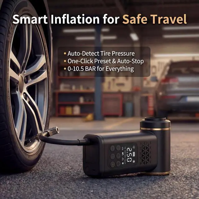 150PSI Fast Inflation & Smart Auto-StopFeaturing 5 preset smart modes (Car, Motorcycle, Bike, Ball, and Inflatable Mattress), this air pump delivers up to 150 PSI (10.35 Bar) with precision. The real-time LCD display accurately detects tire pressure, while the "Auto-Stop" feature ensures the pump shuts off once the target pressure is reached, preventing over-inflation and keeping your family safe on the road.