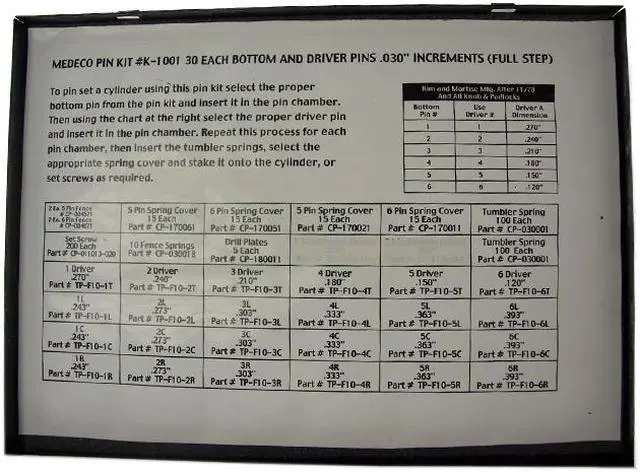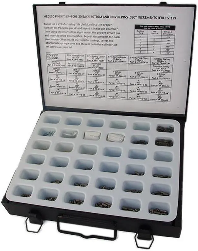 Medeco K-1001 Pinning Kit For The Original 10-50 Series F/S Pins, specially designed as a, full step, door hardware pin kit with 30 of each of the 18 different types of pins. This kit includes springs, and spring covers.