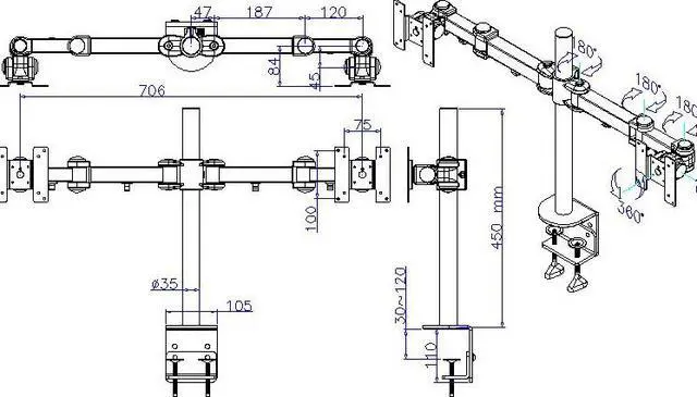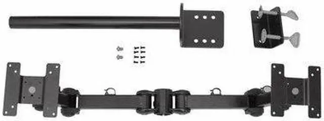 General Features -Fully articulate arms allow each of your monitors a full range of motion—forward and back, left to right, and a complete 360° rotation. -The mounting brackets can be raised or lowered on the pole, allowing adjustments to the display height for optimal visability! -Each mounting bracket pans 180° left to right so you’ll have no trouble angling your LCDs for the best viewing angles. -An expertly made C-Clamp closes tightly to provide the right support for your situation -Durable exterior coating protects your stand from nicks and scratches, so your display set-up will still look in one year or ten! -Set up is simple, with all tools and hardware included (excepting a standard sized Phillips-head screwdriver) along with a set of easy-to-follow instructions
