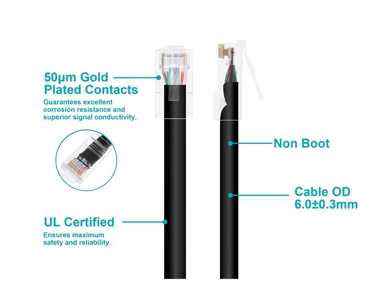 - Buy with Confidence: With Monoprice's Lifetime Warranty on all Cables, you can rest assured we stand behind our products and our customers.|24AWG stranded, pure bare copper conductors 550MHz bandwidth|No protective plug retaining clip covers|50m gold plated contacts