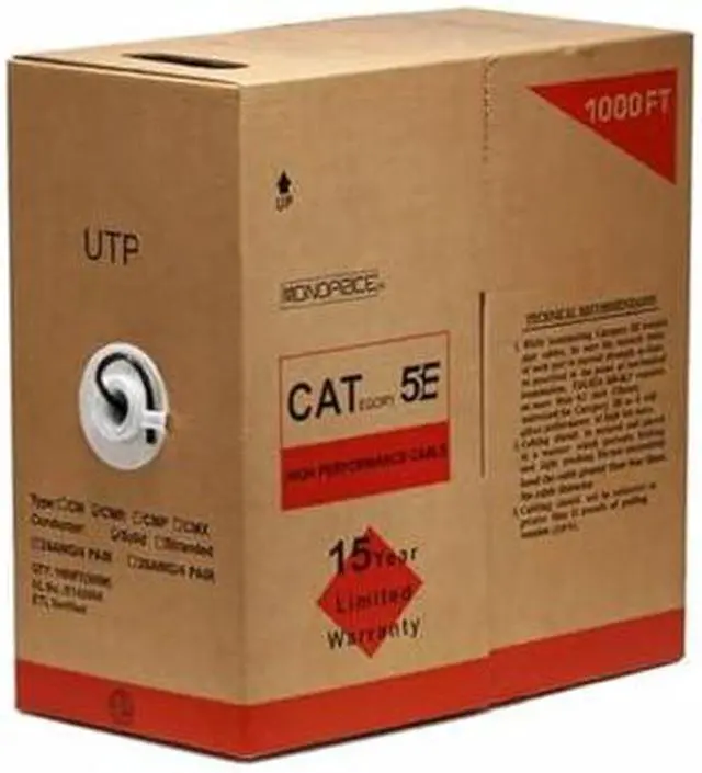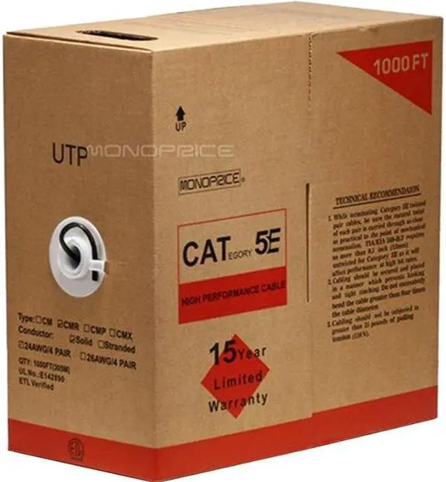 Avoid having excess ethernet cable lying around by building your own cables to the exact length needed using this bulk ethernet copper cable from Monoprice! This 1000 foot roll of unshielded (UTP) cat5e cable uses solid conductors and features 350MHz bandwidth capacity. Solid conductors have slightly better electrical properties than stranded conductors, making solid cables well suited for use in permanent, in-wall installations and for longer cable runs. This cable carries a CMR fire safety rating, which means that it is safe for use within the walls and between the floors of commercial buildings.