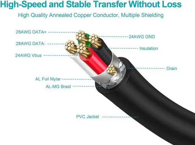 The USB micro B connector has become the new universal standard connector used on most smartphones and tablets. This USB 2.0 cable features a USB A male plug on one end and a USB micro B male plug on the other end. The connectors are gold plated to ensure smooth, corrosion-free connections. It uses 28awg conductors for data and 24awg conductors for power. It is shielded and features a single ferrite core to protect against signal interference and data loss.