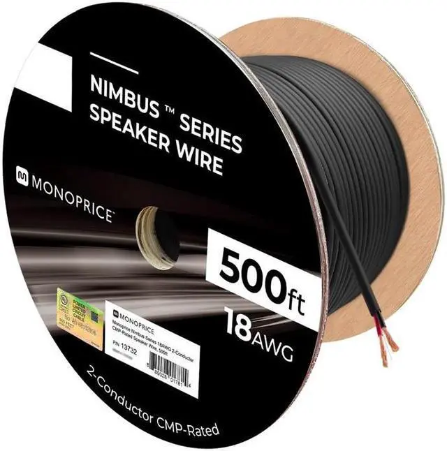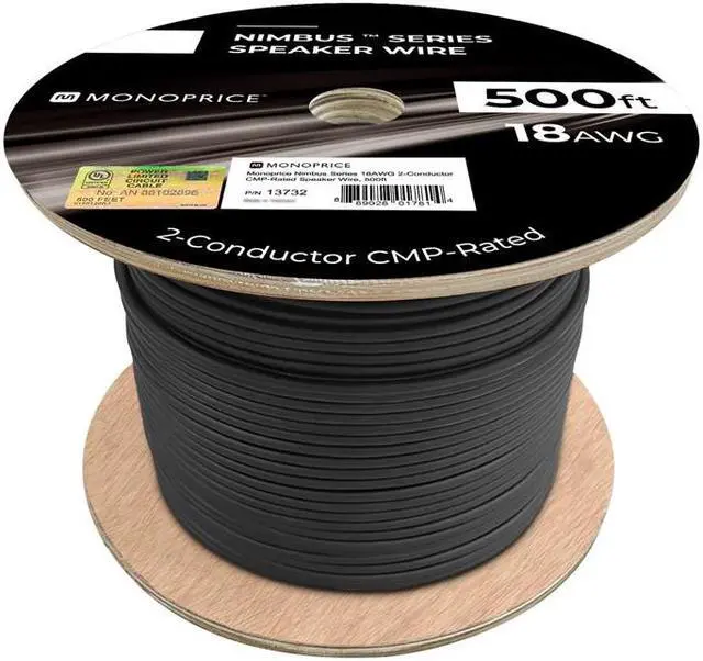Monoprice Nimbus Series 18 Gauge AWG 2 Conductor CMP-Rated Speaker Wire / Cable - 500ft UL Plenum Rated, 100% Pure Bare Copper With Color Coded Conductors