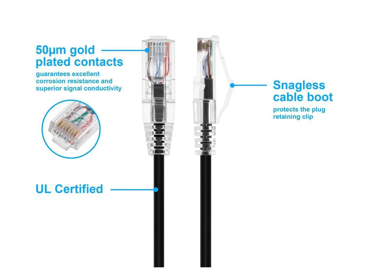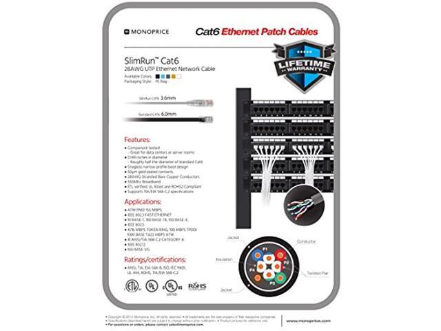 - Buy with Confidence: With Monoprice's Lifetime Warranty on all Cables, you can rest assured we stand behind our products and our customers.|Reduces congestion in high density spaces.|Component-tested for optimized channel performance.|Snagless narrow profile boot design.