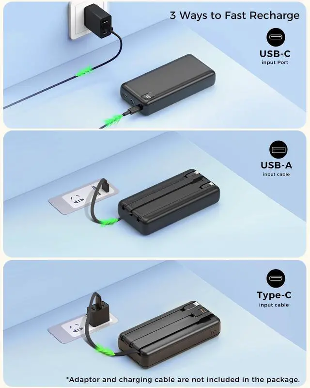 | Special features | Built In 3 Cables (USB-C, iOS, USB-A), Digital Display, Portable Travel Charger, Support PD 22.5W Fast Charging&20W Recharging, 50000mAh Huge Power to Go, 5 Output 2 Input, Auto Shut-Off, Over Charging Protection, LED Indicator Light. |