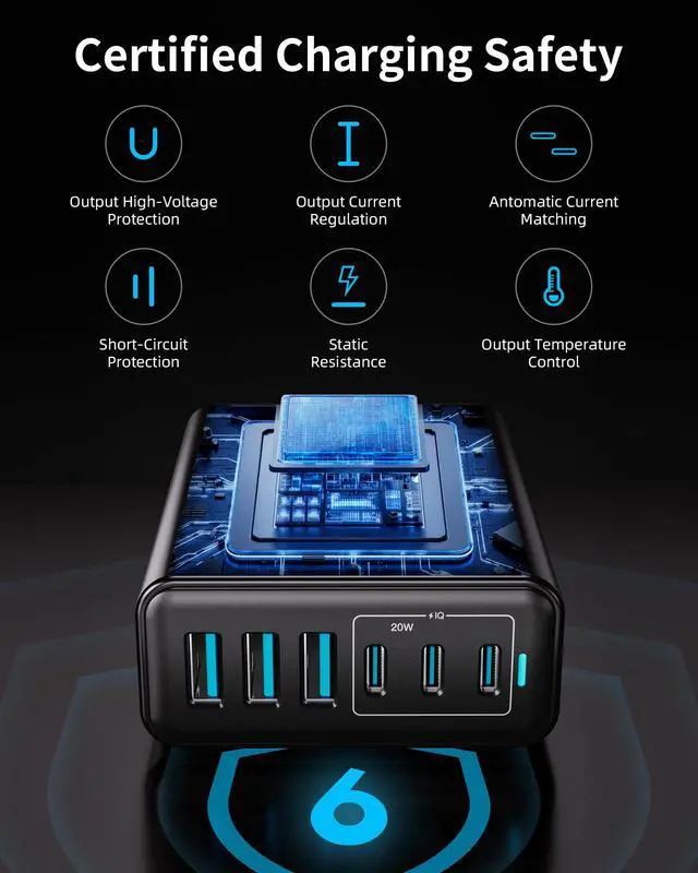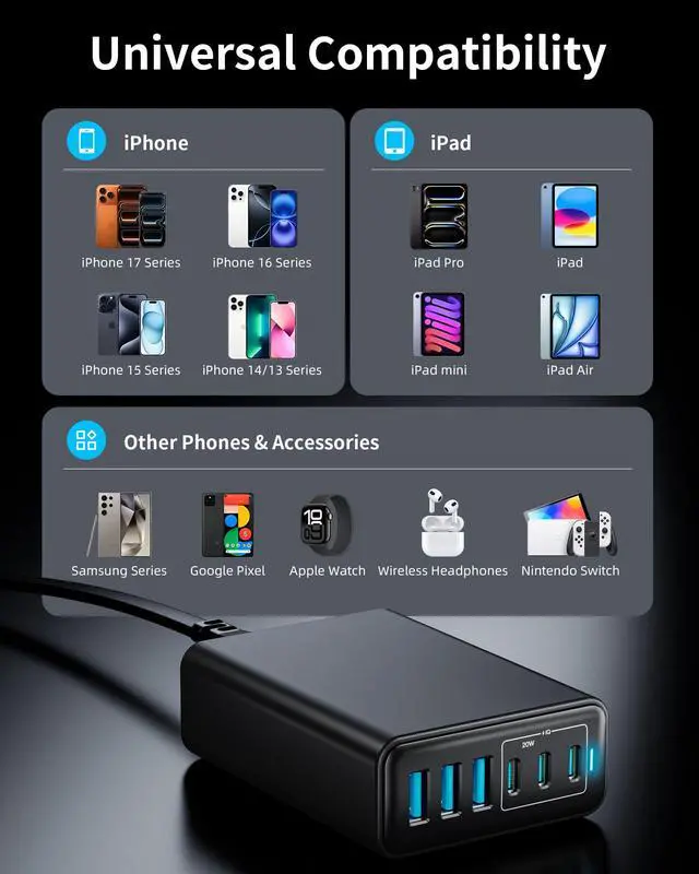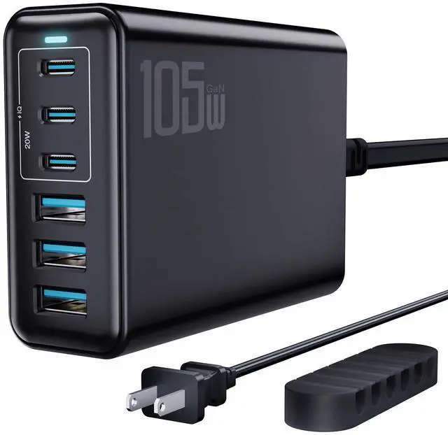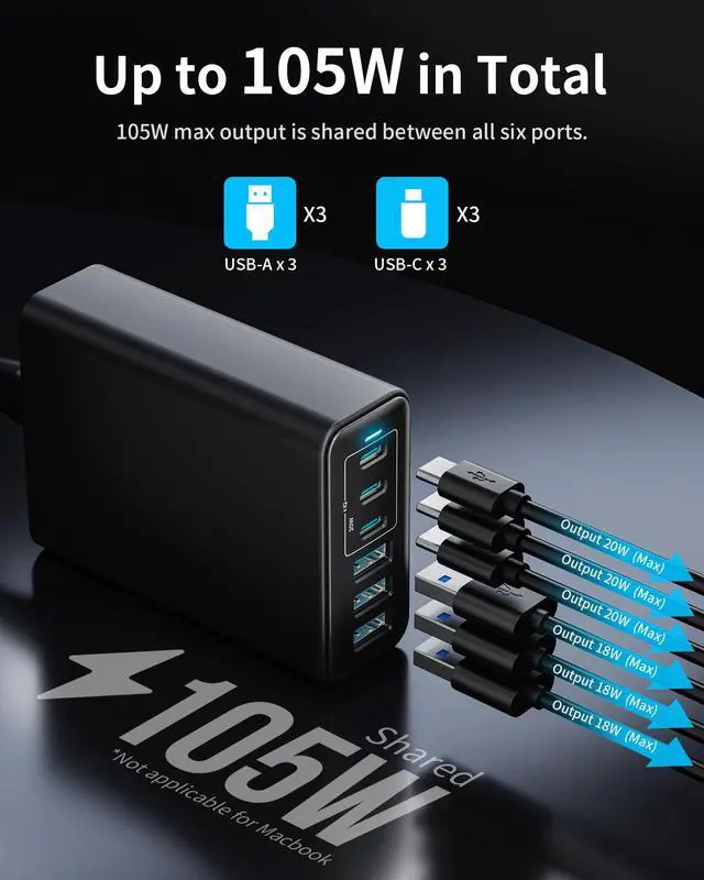 105W Multi-Device ChargerFeaturing 3 USB-C and 3 USB-A ports, this charger delivers a total output of 105W, providing ample power to charge multiple devices at once.
