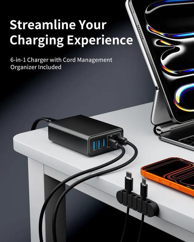 USB C Charger Block, 105W Max GaN 6-Port Fast Desktop Charging Station, Wall Charger Power Strip Adapter Plug for iPhone 17/16/15, iPad, Samsung and More (Cable Organizer Included)