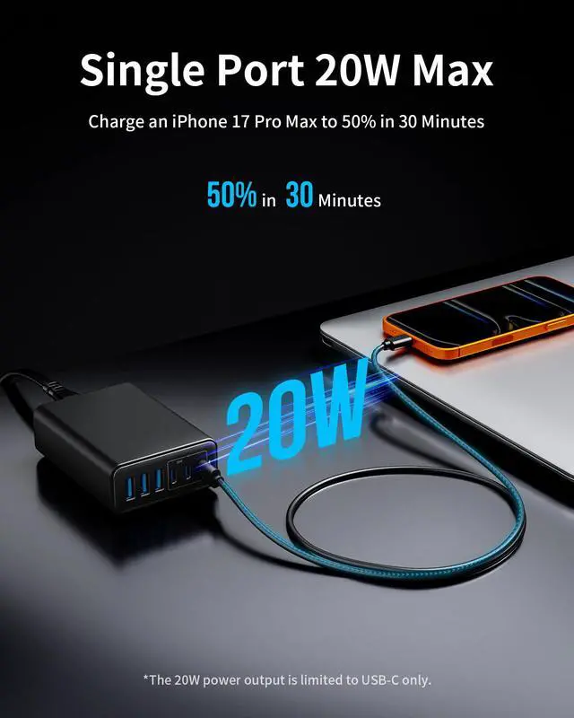 High Power, Quick ChargeEffortlessly charge your MacBook Air to 50% in just 1 hour and 40 minutes, or rapidly power your iPhone 17 Pro Max from 0 to 50% in just 30 minutes using a single 20W max charging port.
