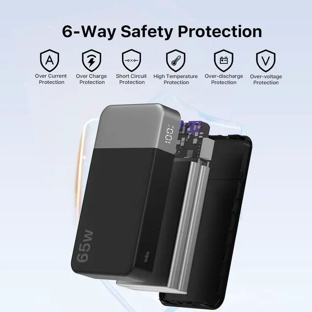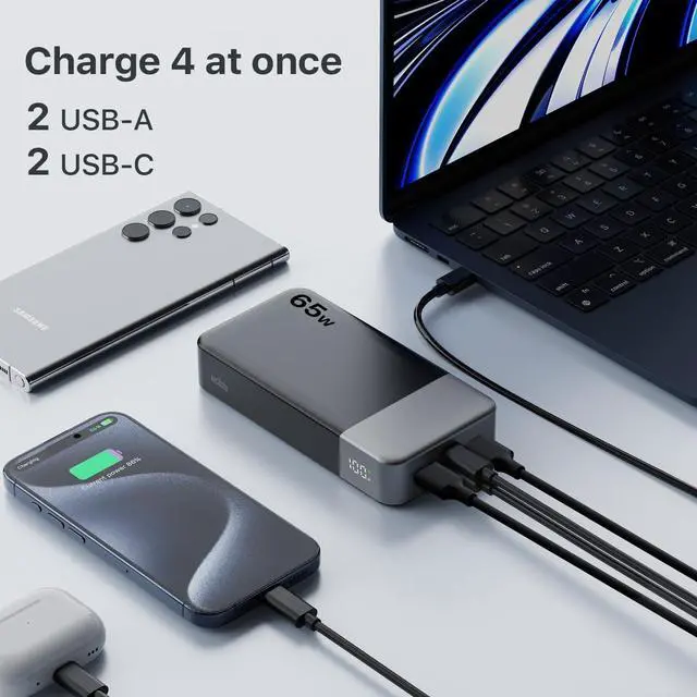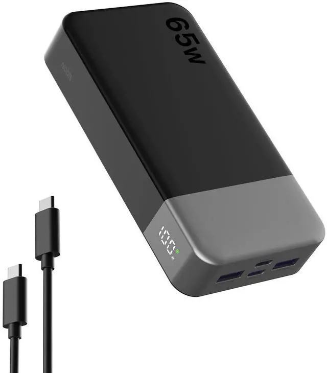 65W Bi-Directional Fast Charging This portable charger features 65W high-power PD fast charging, swiftly topping up your laptop and other devices. It also supports 65W input for rapid self-recharging, minimizing downtime for the power bank itself