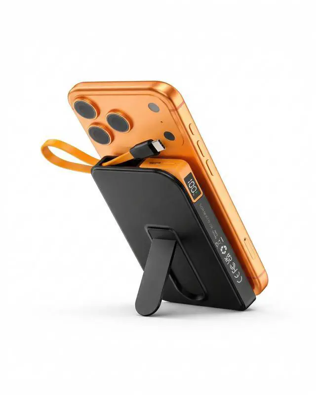 The powerbank Works with iPhone 17/16/15/14/13/12 series via built-in magnets.