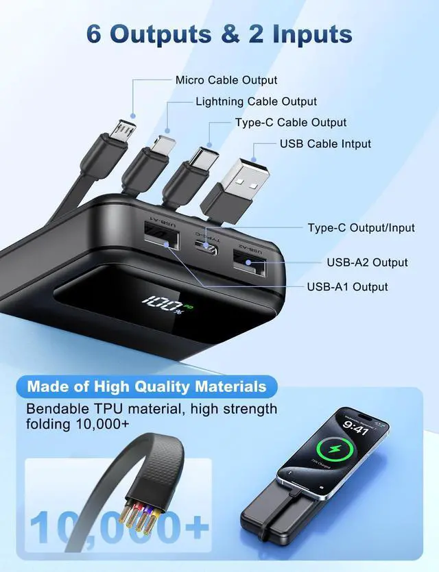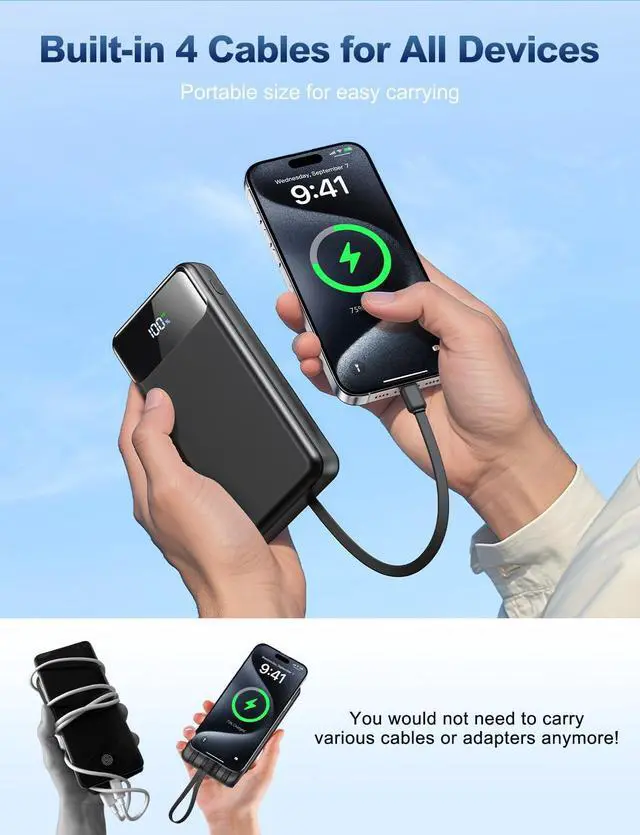 Portable Charger Power Bank 50000mAh Battery Pack, 22.5W Fast Charging PowerBank with Built in Cables,Travel Camping Essential USB-C Portable Phone Charger for iPhone Samsung Pixel Android iPad