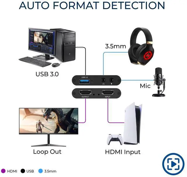 HDMI LOOP-OUT FOR ZERO-DELAY GAMING Built-in HDMI loop-out lets you view your gameplay in real time on a TV or monitor with no lag, while simultaneously capturing the video on your computer, perfect for competitive gaming, walkthroughs, tutorials, and esports streaming. Also Headphone 3.5 Stereo Out.