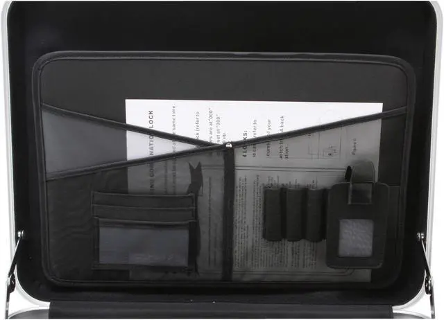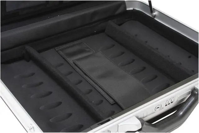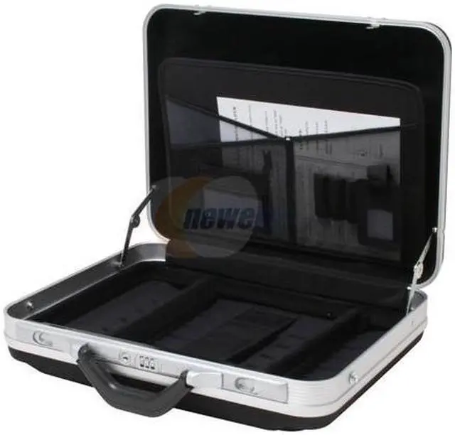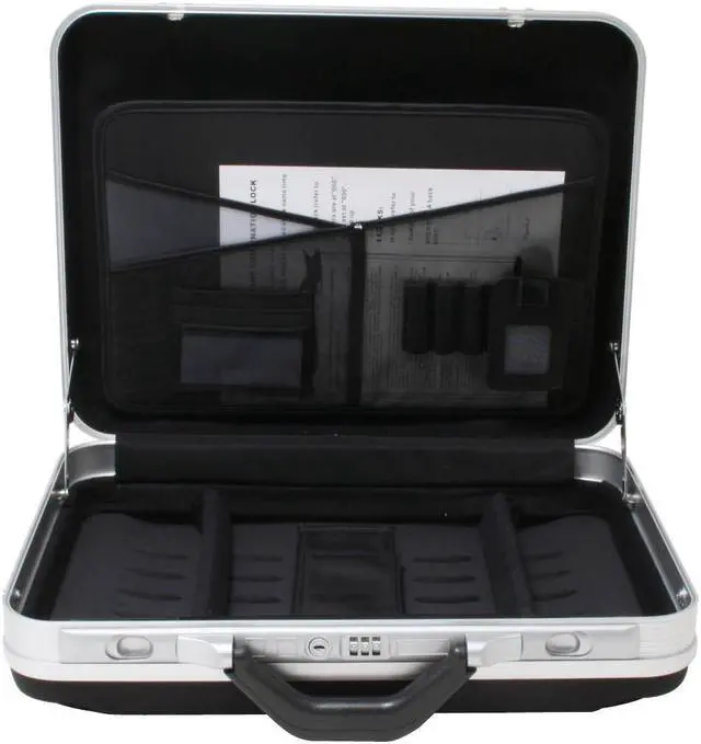 | Features | Holds up to a 16" notebook computer; Aluminum profile; Hard-sided panels with a textile outside covering; Dual key and combination locks; Removable shoulder strap; Separate notebook compartment with removable dividers; |