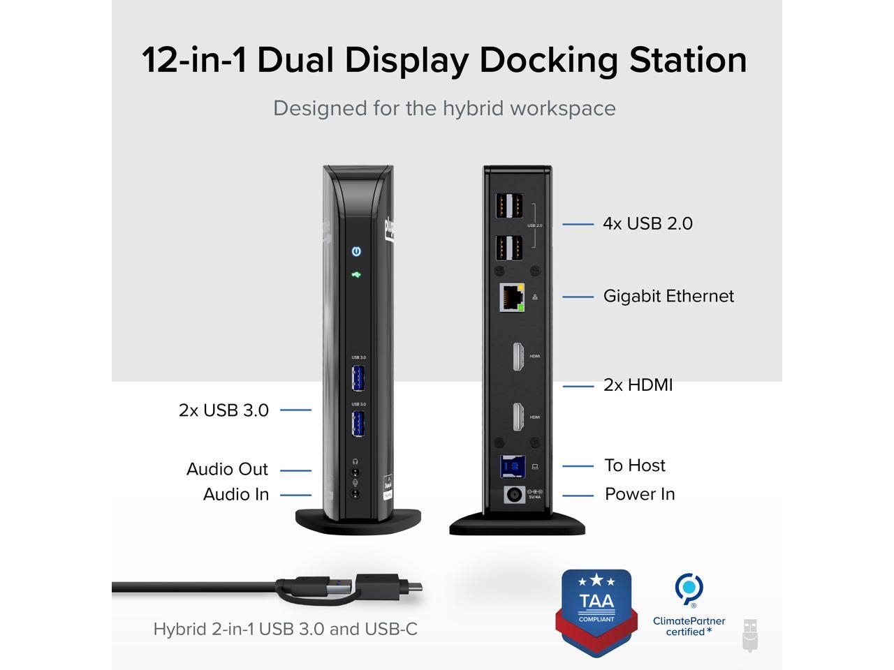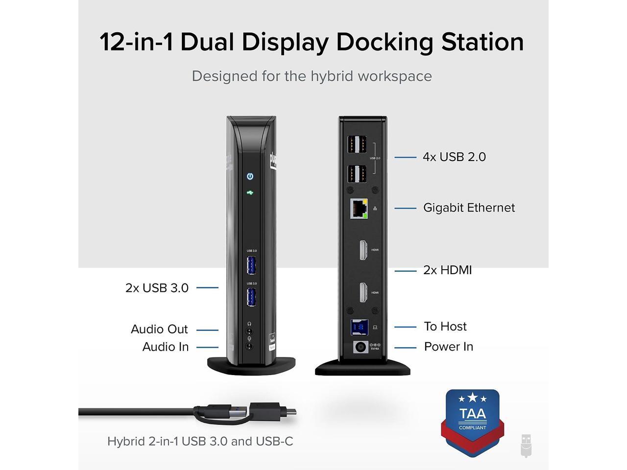 - Flexible Expandability - Featuring a hybrid 2-in-1 USB 3.0 and USB-C cable, a single connection from a host PC to this USB dock provides dual video outputs, wired Gigabit Ethernet, 3.5mm Headphone and Microphone jacks, two USB 3.0 ports, and four USB 2.0 ports