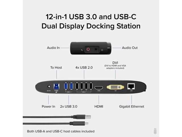 - FLEXIBLE EXPANDABILITY - A single included USB 3.0 or USB-C cable from your laptop to this dock provides dual video outputs, wired Gigabit Ethernet, 3.5mm Headphone and Microphone jacks, two USB 3.0 ports, and four USB 2.0 ports