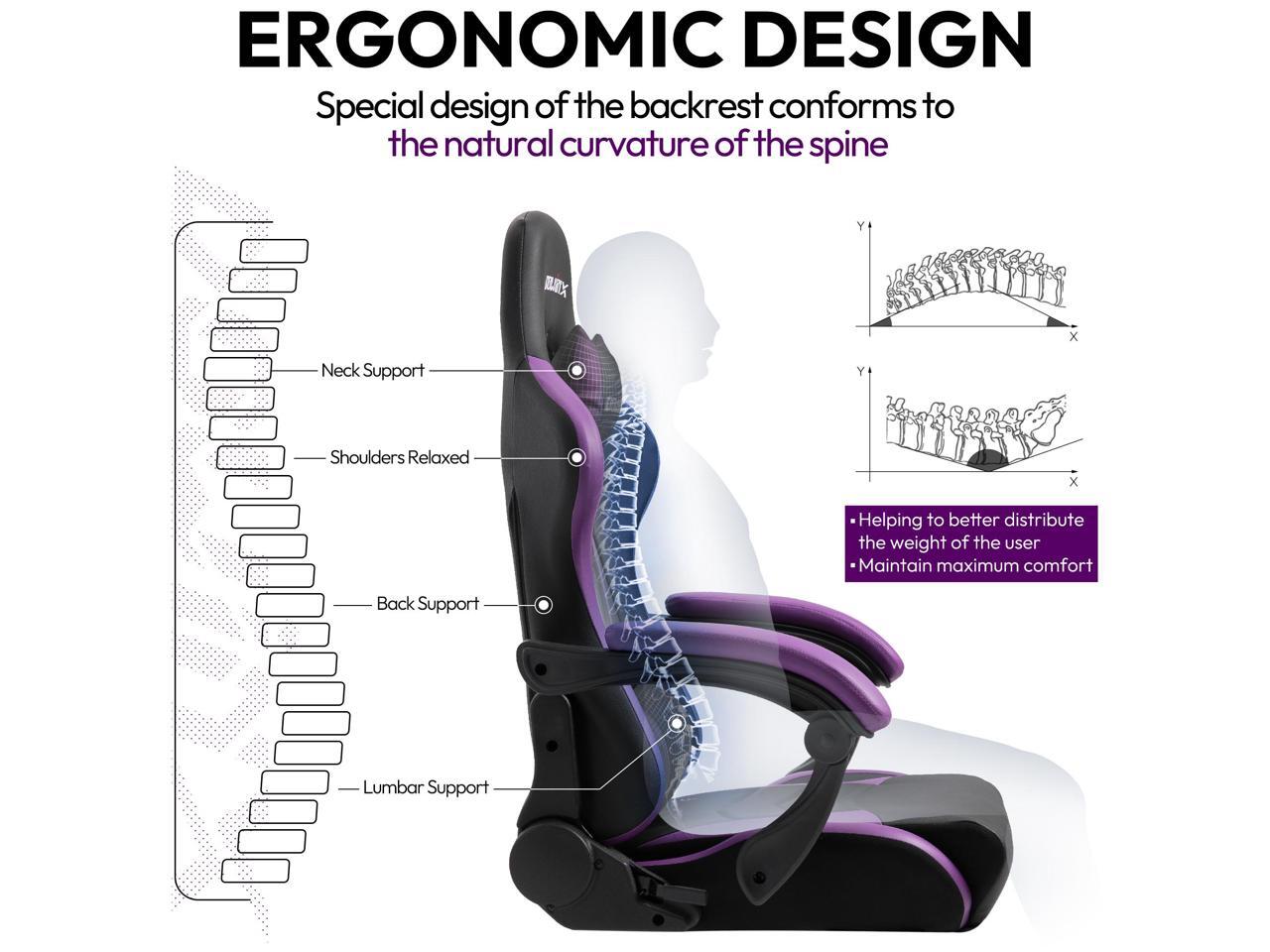 - FOR BOTH GAMER AND OFFICE WORKER: The big and tall gaming chair with winged back provides multi-point body contact to share the pressure, save your spine and lumbar with ergonomic back and massage support. Lean your legs more comfortable with bucket seat design.