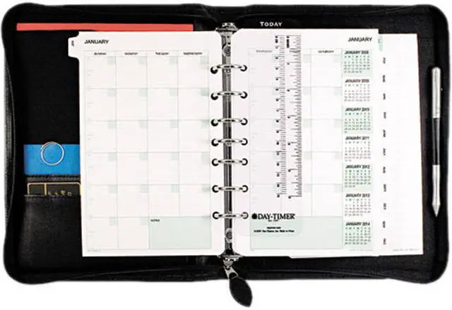 Features high-quality bonded leather from recycled leather fibers for a polished, professional look. Large external storage pocket and various inside pockets offer additional storage. Includes three months of undated planning pages, 12 undated and tabbed monthly dividers, tabbed telephone/address pages and assorted reference pages. Zippered closure with pull-tab ensures everything stays safe.