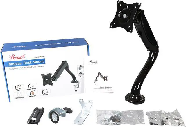The Rosewill RMS-16001 is a high-quality, full-motion single monitor gas spring arm desk mount. It supports monitors/screens from 13 to 27 inches* in size, weighing up to 13.2 pounds, and is compatible with VESA 75mm and 100mm. Once mounted to it, your monitor can extend, tilt, swivel, and even rotate for an optimal viewing experience. The sturdy aluminum arm with built-in gas spring facilitates easy height adjustment. The included hardware makes installation a snap.
