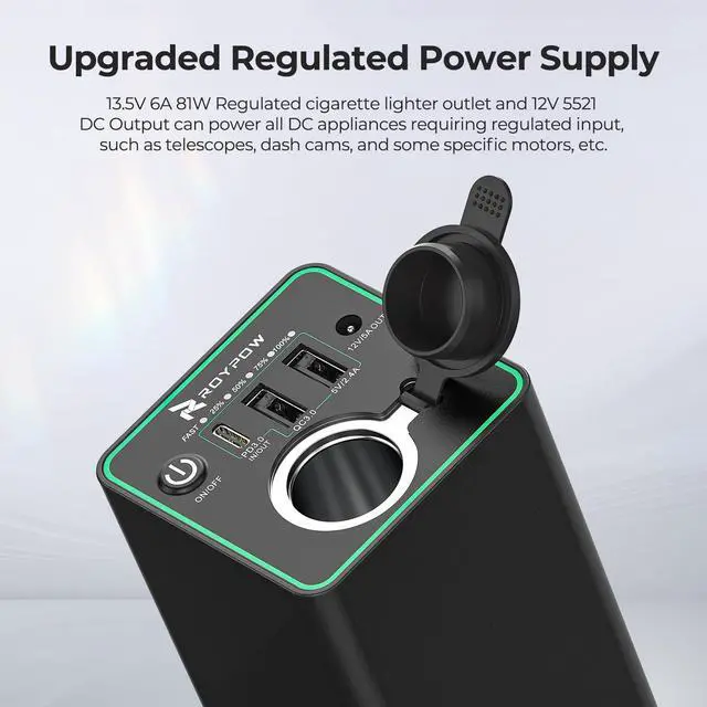 Besides the maximum unregulated 120W output, the upgraded regulated Power Control chipset allows the cigarette lighter outlet and 12V 5521 DC Output to provide 13.5V 6A 72W Regulated Output to power all DC appliances requiring regulated input, more friendly to devices with low-voltage / low-power protection, such as telescopes, dash cam, and some specific motors, etc.