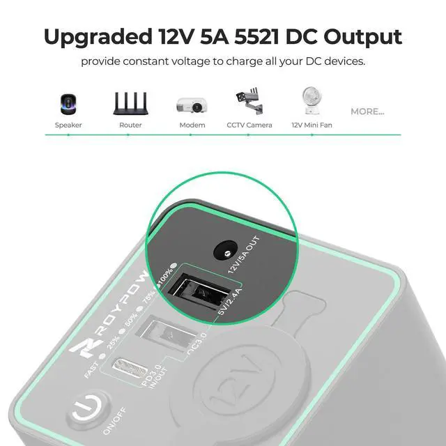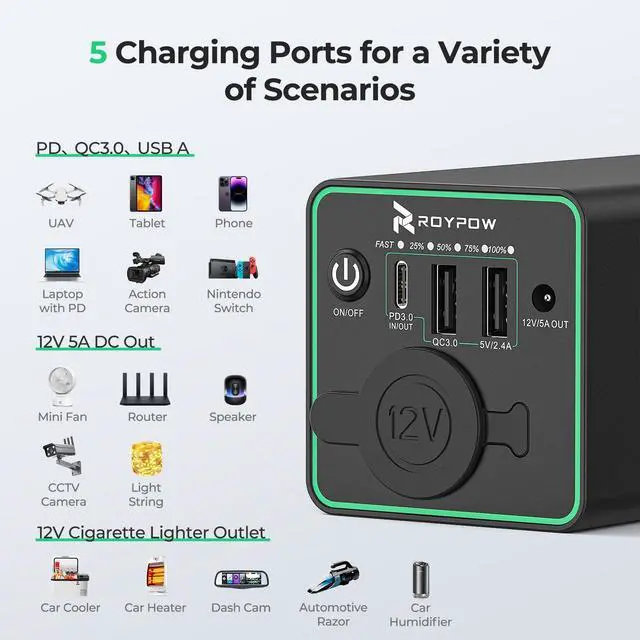 RoyPow High-capacity Portable Power Station with PD & QC & Cigarette Lighter Outlet & 12V DC Output