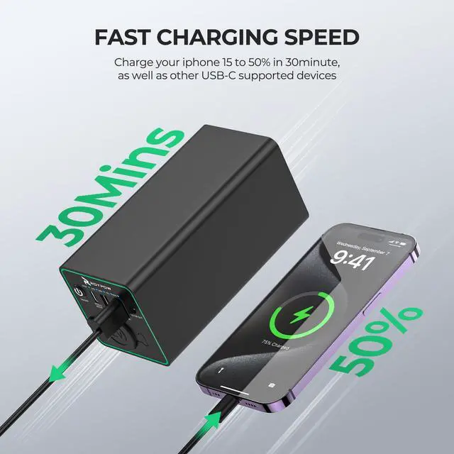 30W PD & 18W QC output allow you to efficiently and quickly charge all your USB C supported devices. Charge your iPhone 15 to 50% in 30minutes.