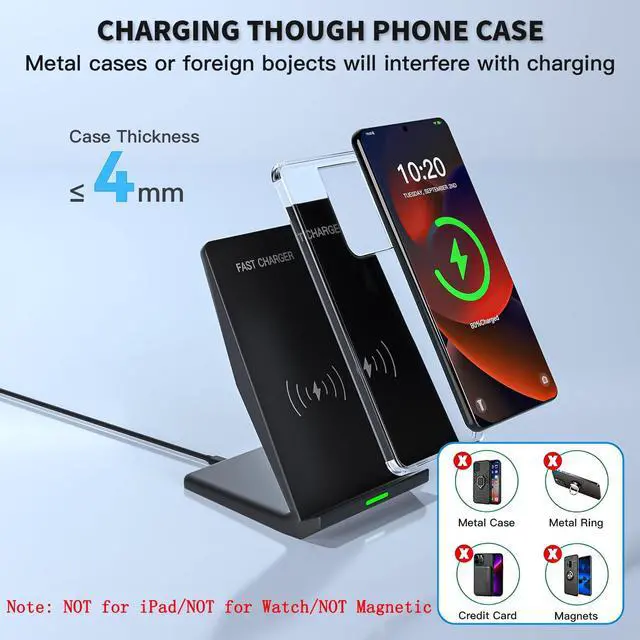 Charges directly through most cases up to 5mm thick (plastic,silicone,TPU).A subtle LED light indicates charging status and turns off after 10 seconds to avoid nighttime distractions.The non-slip base and optimized angle provide stable support for all phone sizes,even with curved screens.
